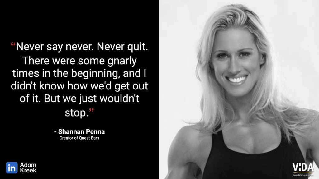 When Quest creator Shannan Penna made her first protein bar, she experimented in a small kitchen using a rolling pin and a trusted team of wellness professionals. Her first target? Make two bars that people love. The next target for Quest? Find a machine to make more bars more effectively. The next target? Keep up bar Quality with that new machine. The next target? Find another machine. The next target? You get my point. Having a plan and consistently focusing on the next step helped this company grow 5,700% in the first three years.