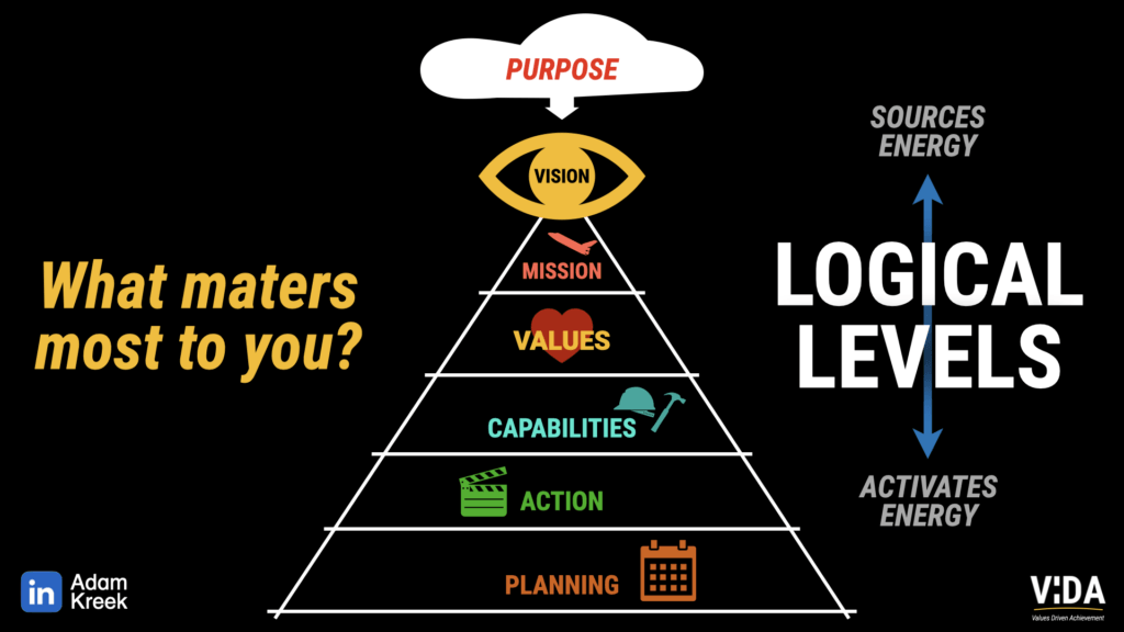 Integrating Dilts' model with the ViDA framework enhances the process of values identification and alignment. By examining the Beliefs and Values level, individuals can uncover core principles that drive behaviour and decision-making. Aligning these values with one's Identity ensures authenticity and coherence across all levels. Furthermore, recognizing how values influence capabilities and behavior enables targeted personal development and fosters growth that is congruent with one's foundational beliefs. This alignment facilitates personal fulfillment and enhances effectiveness in various life domains, as actions become a natural extension of deeply held values.