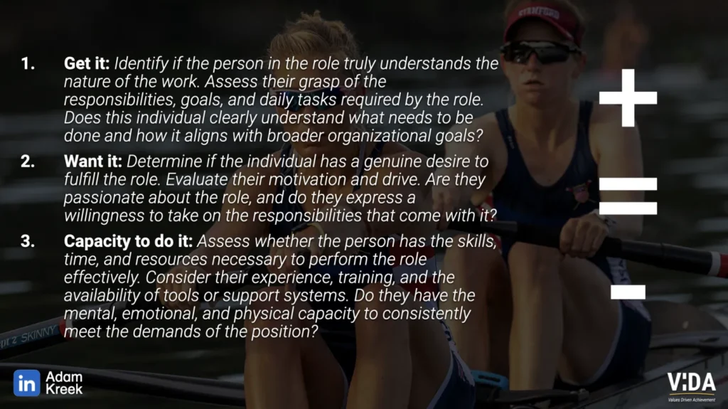 Does the person genuinely want the seat they’re in? Passion, drive, and energy matter. If the fire isn’t there, no amount of skills or capacity will sustain long-term performance.