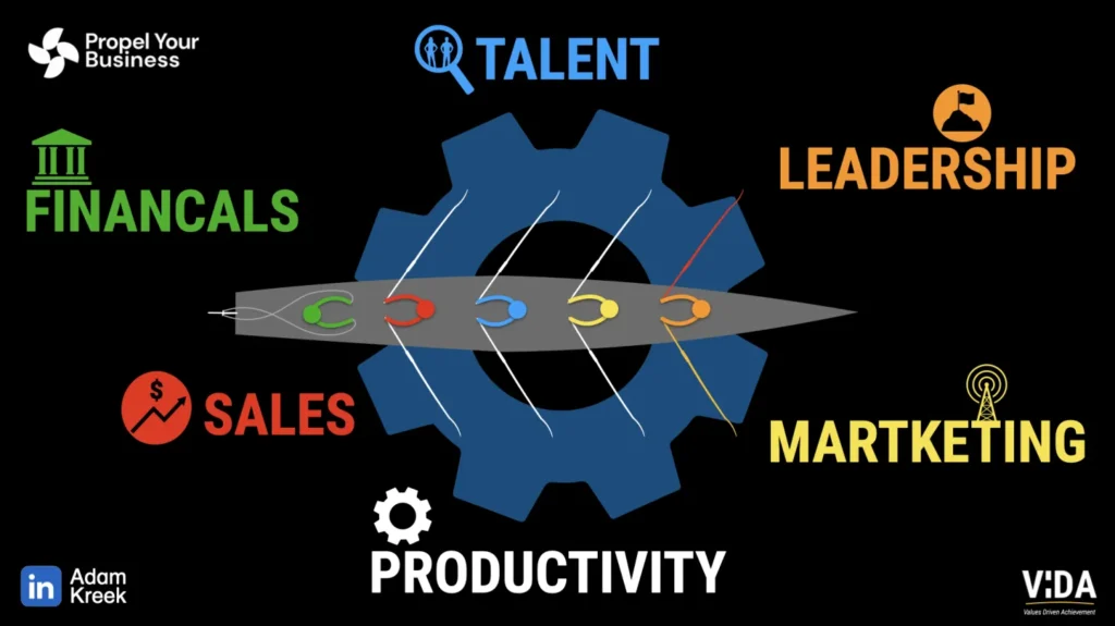 When all six seats are aligned—financials, sales, talent, marketing, leadership, and productivity—you row with power, precision, and purpose.