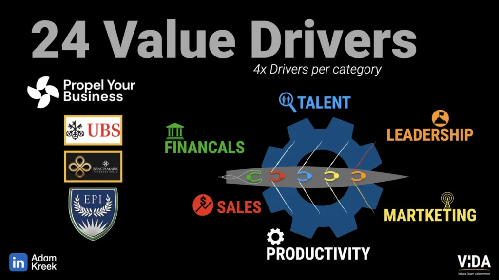 Based on frameworks from Propel Your Business, EPI, and Cultivate Advisors, we’ve identified six enterprise value categories. Each includes four key drivers to stop the chaos and boost your valuation.