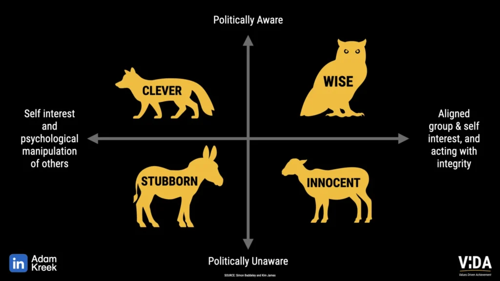 Simon Baddeley and Kim James developed a model of organizational politics that helps us see the different ways people engage with power. They mapped two dimensions: