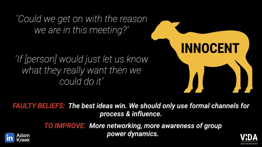 The sheep believes the best ideas always win and that formal processes are all that matter. They ignore informal influence networks and hope others will ājust be reasonable.ā Their lack of political savvy often leaves them sidelined, even when their ideas are good.