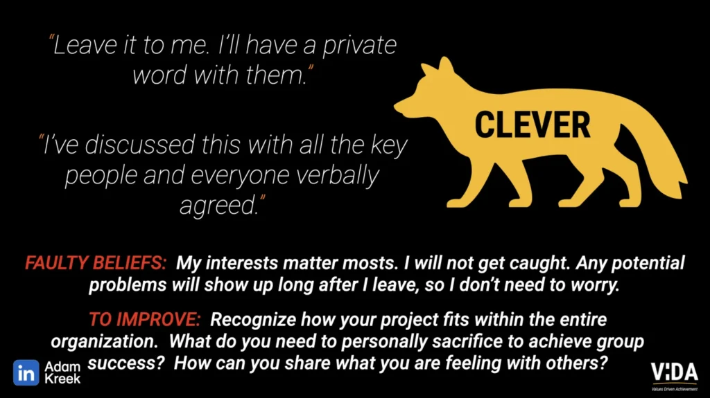 The fox knows exactly how things get doneābut uses this insight for personal gain. They manipulate behind closed doors, build alliances that serve themselves, and assume problems wonāt catch up with them. Short-term, they often rise. Long-term, they erode trust and drain value.