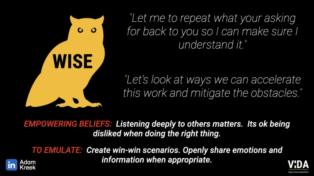 The owl listens deeply, shares information openly, and looks for win-win solutions. They can communicate well. Owls understand power dynamics and use them to benefit the whole. Their empowering belief: Itās okay to be disliked when youāre doing the right thing. These are the leaders we need more of.
