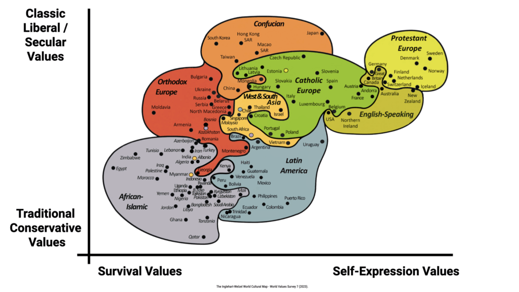 The second dimension, Survival vs. Self-expression values, highlights the contrast between societies focused on economic and physical security versus those emphasizing environmental protection, tolerance, and participatory decision-making. Societies that prioritize survival values tend to be ethnocentric and intolerant, whereas those valuing self-expression emphasize individual autonomy and diversity.