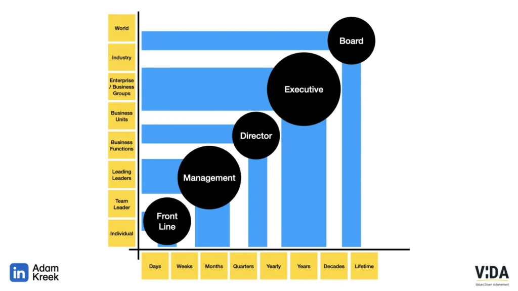 Effective strategic deployment requires leaders to operate at the correct altitude. Here’s how scope evolves as organizations grow: