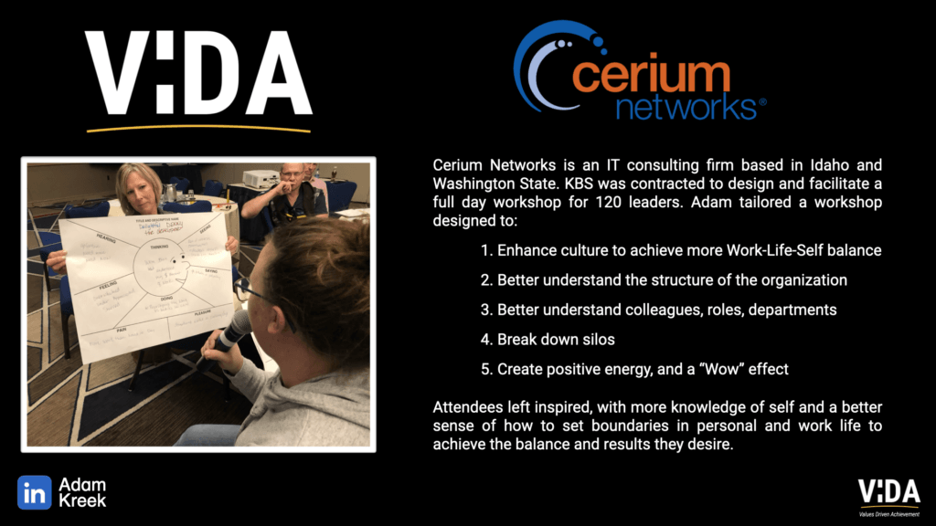 Cerium Networks is an IT consulting firm based in Idaho and Washington State. ViDA was contracted to design and facilitate a full-day workshop for 120 leaders. Adam tailored a workshop designed to:
