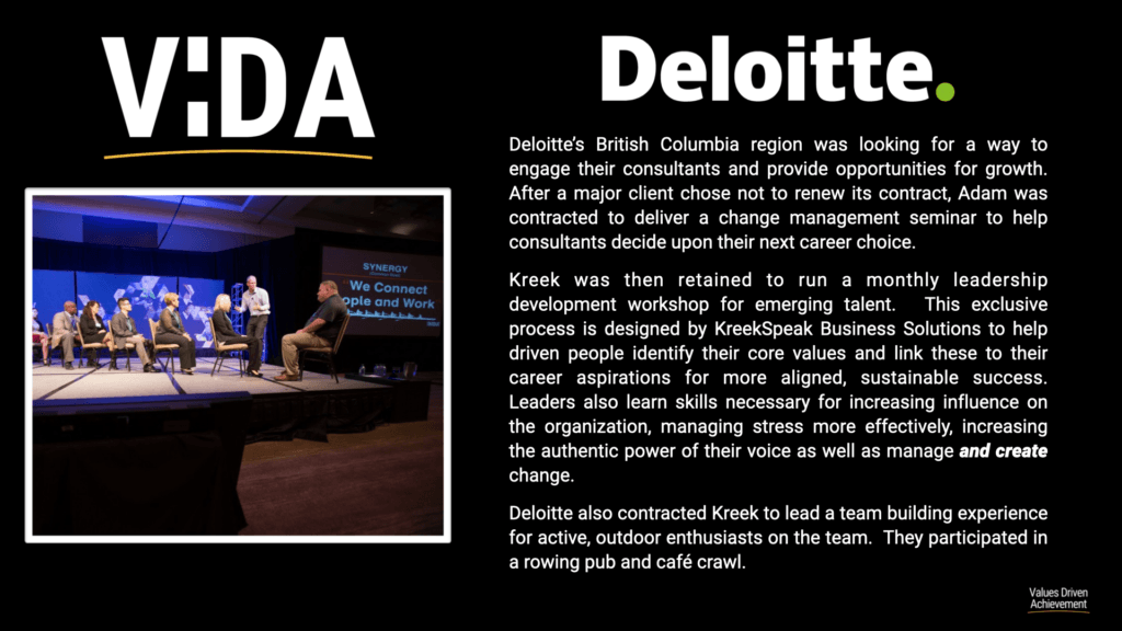 Deloitte's British Columbia region was looking for a way to engage their consultants and provide opportunities for growth. After a major client chose not to renew its contract, Adam was contracted to deliver a change management seminar to help consultants decide upon their next career choice.